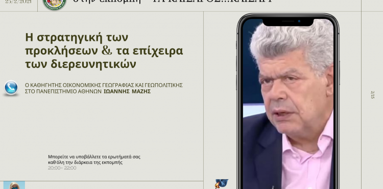 ΜΕΤΑΜΝΗΜΟΝΙΑΚΗ ΕΚΠΟΜΠΗ No _ 66 Την ΠΕΜΠΤΗ 25/2/21 καλεσμένος στην εκπομπή,ο Καθηγητής Οικονομικής Γεωγραφίας και Γεωπολιτικής του Καποδιστριακού Πανεπιστημίου Αθηνών κ. ΙΩΑΝΝΗΣ ΜΑΖΗΣ…   ΘΕΜΑ: Η στρατηγική των προκλήσεων και[Read more…]