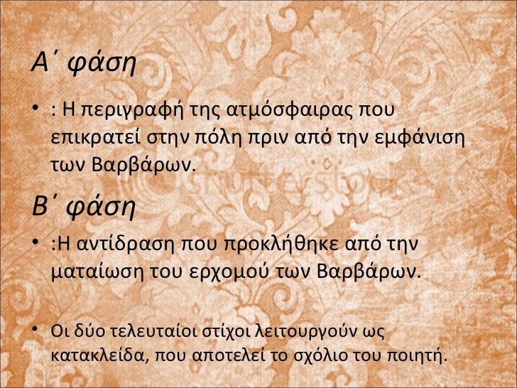 — Τι περιμένουμε στην αγορά συναθροισμένοι; Είναι οι βάρβαροι να φθάσουν σήμερα. — Γιατί μέσα στην Σύγκλητο μια τέτοια απραξία;Τι κάθοντ’ οι Συγκλητικοί και δεν νομοθετούνε; Γιατί οι βάρβαροι θα φθάσουν σήμερα.Τι νόμους πια θα κάμουν οι Συγκλητικοί;Οι βάρβαροι σαν έλθουν θα νομοθετήσουν. —Γιατί ο αυτοκράτωρ μας τόσο πρωί σηκώθη,και κάθεται στης πόλεως την πιο μεγάλη πύληστον θρόνο επάνω, επίσημος, φορώντας την κορώνα; Γιατί οι βάρβαροι θα φθάσουν σήμερα.Κι ο αυτοκράτωρ περιμένει να δεχθείτον αρχηγό τους. Μάλιστα ετοίμασεγια να τον δώσει μια περγαμηνή. Εκείτον έγραψε τίτλους πολλούς κι ονόματα. — Γιατί οι δυο μας ύπατοι κ’ οι πραίτορες εβγήκανσήμερα με… Διαβάστε περισσότερα/Read more »