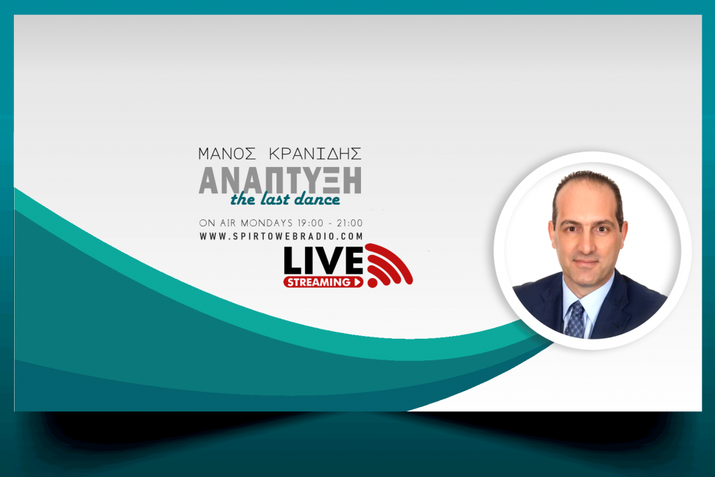 Ο ΜΑΝΟΣ ΚΡΑΝΙΔΗΣ, κάθε Δευτέρα απόγευμα στις 7, μας ξεναγεί στη γη της επαγγελίας – the promised land, με την εκπομπή ΑΝΑΠΤΥΞΗ – THE LAST DANCE, με σύγχρονες αναλύσεις και πρακτικές συμβουλές για το πως θα επιτευχθεί δυναμική ανάπτυξη της πραγματικής οικονομίας της Ελλάδας, με εποικοδομητική ανταλλαγή απόψεων, αξιοποιώντας την τελευταία μεγάλη ευκαιρία, τον Τελευταίο Χορό…!!!