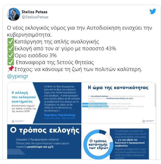 οι βασικές αλλαγές: Επαναφέρεται η 5ετής θητεία για τους Δημάρχους και Περιφερειάρχες που θα εκλεγούν τον Οκτώβριο του 2023. Μειώνεται οριακά ο αριθμός των μελών του Δημοτικού και του Περιφερειακού Συμβουλίου. Το όριο εκλογής από τον πρώτο γύρο τίθεται στο 43%, 1% μεγαλύτερο από αυτό που ίσχυσε στις εκλογές του 2006. Εξασφαλίζεται κατά κανόνα τουλάχιστον η εκλογή των 3/5 των μελών του Συμβουλίου στον νικητή των εκλογών. Τίθεται όριο 3% για τη εκλογή Δημοτικού ή Περιφερειακού Συμβούλου, το οποίο είναι ευθυγραμμισμένο με το ισχύον στις βουλευτικές εκλογές. Καταργείται η ξεχωριστή κάλπη για την εκλογή των «κοινοτικών Αρχών» η οποία δημιούργησε… Διαβάστε περισσότερα/Read more »